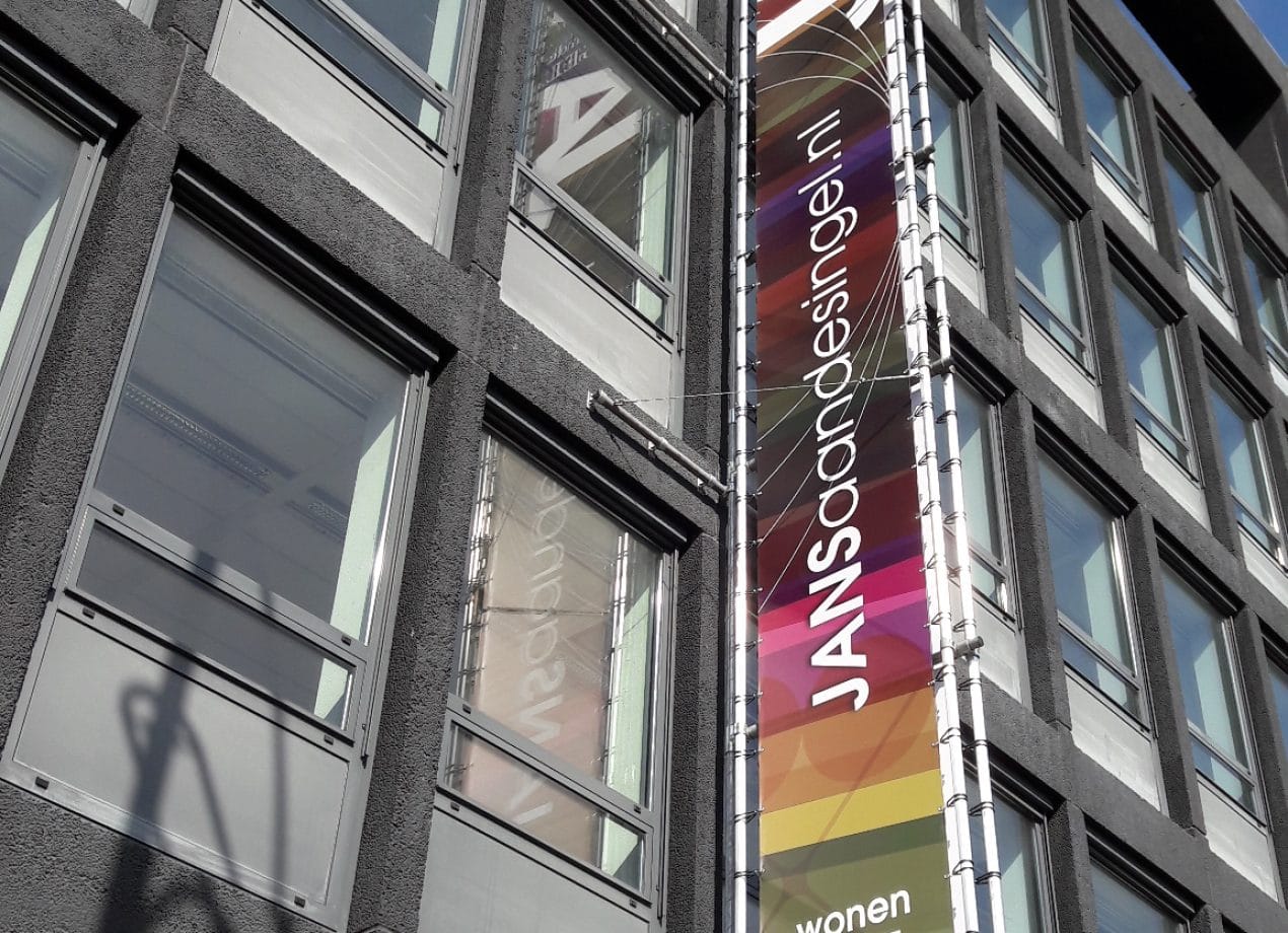 Een haakse baniervlag op de gevel grijpt op een stijlvolle manier de aandacht van voorbijgangers. De haakse gevelbanner is aan twee zijden bedrukt, waardoor de vlag een opvallend onderdeel van uw winkel of bedrijf wordt.